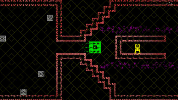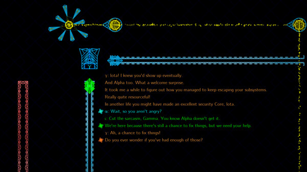 Alpha and Iota is a puzzle platformer about repairing a damaged computer system inhabited by sentient agents, and controlled by a mysterious organization known as the Company. You operate a repair core, which can navigate the system by ejecting between a variety of different hosts, each with their own dynamics and abilities. Some hosts are fixed in place, while others jump, slide, climb walls, or follow rails. To progress, it is often necessary to utilize several hosts in combination, taking advantage of each of their unique qualities and the rich interactions between them.