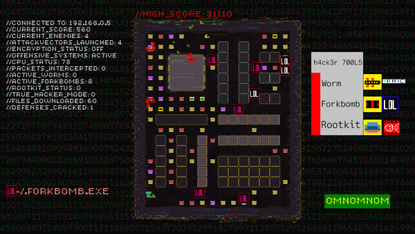 {FORKBOMBS} - Moving back and forth in a single direction, or acting as a barrier, these will decimate your enemies and let you roam freely. However, they cannot collect data files.