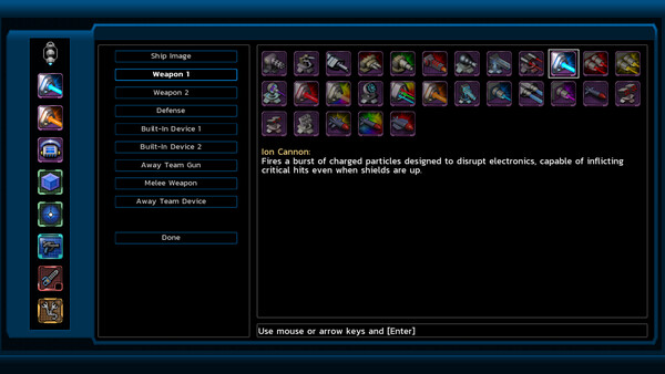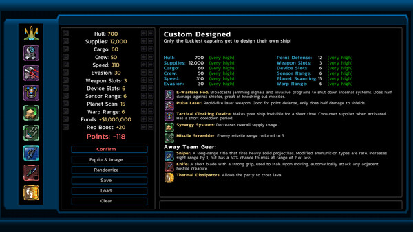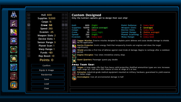 Use a point-based system to choose your starting ship's stats. Then assign weapons, devices, and away team gear from everything in the game!