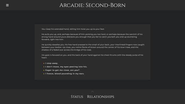 Interact with a vivid cast of characters, each with their own goals and motivations. Gain their support, their friendship or even their love. Experience naturally-evolving romance; steamy, sweet, passionate, or even thoroughly ill-advised. Your relationships will change the story, in small and bigger ways.Control the story