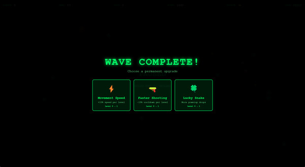 8 постоянных улучшений: Урон, Скорострельность, Прочность, Скорость — выбери одно после каждой волны.