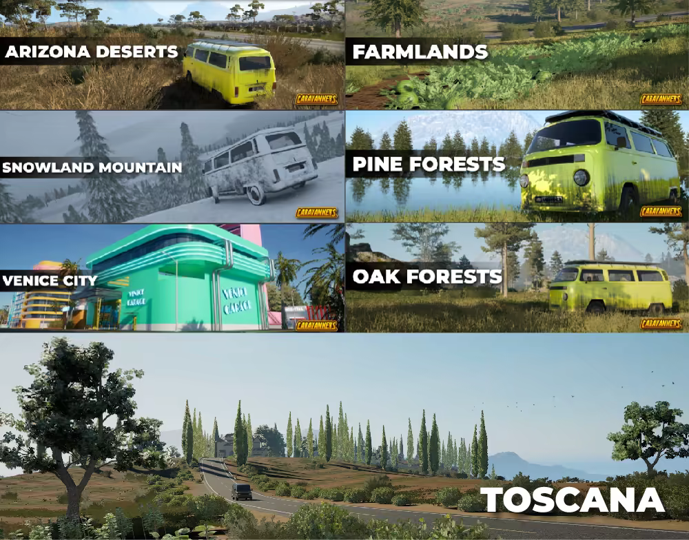 Caravanners — это расслабляющее приключение о жизни и исследовании, посвящённое домам на колёсах и кемпингу, в огромном открытом мире. Начни с маленького фургона, купи пустой прицеп и создай дом своей мечты. Исследуй природу днём и наслаждайся вечерами у костра с друзьями, слушая музыку и рассказывая истории. 🎵🔥