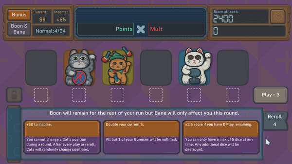 Cats & Dice is a dice-building roguelike all about getting the right synergies to pull off crazy combos and attain as high a score as you possibly can.