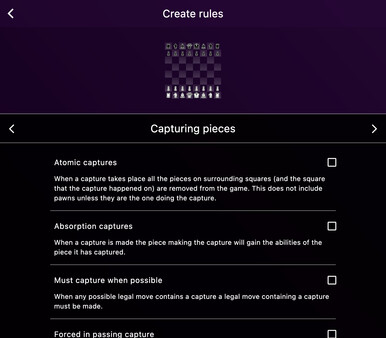 start in random places or just have En Passant be a forced move. Don't like casting? You can turn it off. Want a Rook that also moves like a Knight? You got it. There are limitless possibilities (okay technically there is a limit, but there are so many options you could never play all of them).