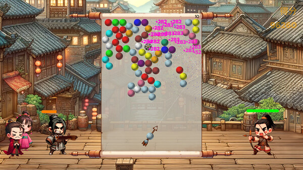 - Стрельба по пузырям: Управляя направлением пусковой установки, игроки стреляют пузыри разных цветов. Когда три или более пузыря одного цвета соединяются, они взрываются, постепенно ослабляя силу свитка. Когда все пузыри уничтожены, свиток закрывается, и стрела Вэй Цина может обойти свиток и поразить убийцу.