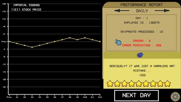 Enjoy working as an Eggnog Inspector for a shady company. Verify the color, art, ingredients for batches of eggnog. Its not glamorous but its an honest living. Who knows what surprises are in store for you...