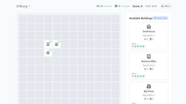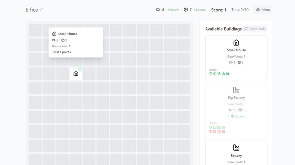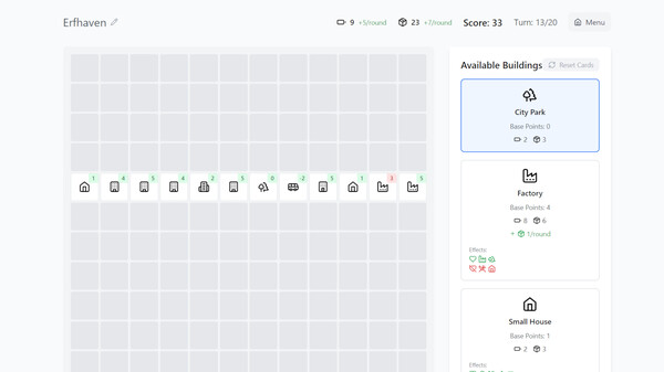 ErfCity is a minimalist city-building puzzle game that challenges your strategic thinking and planning skills. Place buildings on a grid to gather points, but placement is key—your score depends on how cleverly you position buildings near each other.