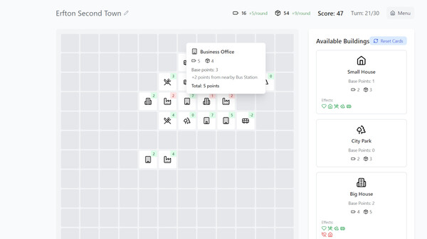 In Challenge Mode, you, the player must carefully plan their city within a set number of turns, maximizing points through synergies. Every decision counts.