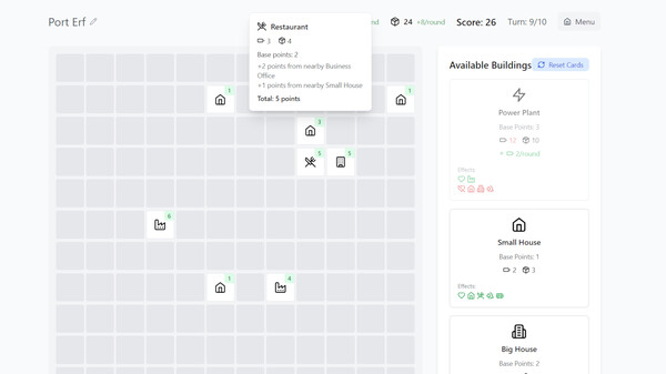 Each round, you'll be offered a choice of 3 random buildings to place on the grid. Choose wisely as synergies between different building types tend to drastically change you score.