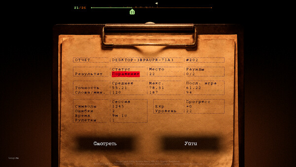 Final Sentence - это королевская битва по печатанию текста. Вместе с другими игроками вы оказываетесь в ангаре, перед вами - пишущая машинка, а у виска - револьвер с одним патроном. Каждая ошибка может быть фатальной. В живых останется только один.