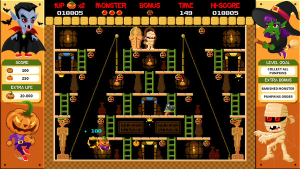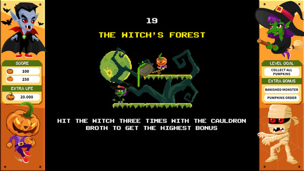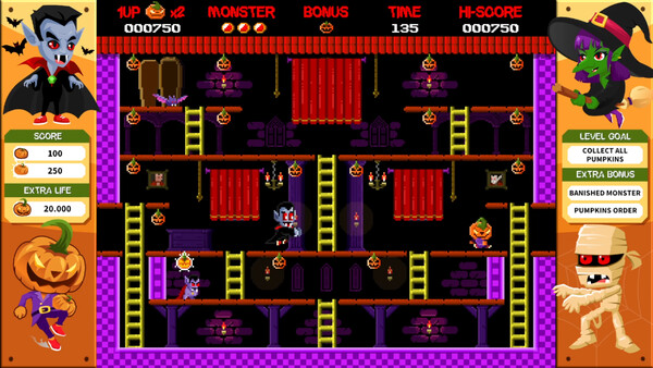 Классический платформер: Бегите, прыгайте и избегайте препятствий, пока возвращаете украденные тыквы и уклоняетесь от атак монстров.