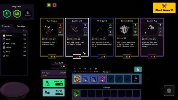 - If you invest gold in leveling up, the number of weapons you can equip increases. You can equip up to 8 weapons.