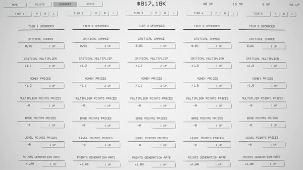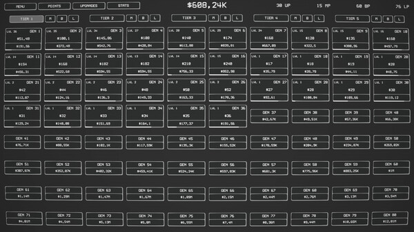 Улучшайте генераторы, открывайте новые тиры, покупайте разнообразные улучшения, занимайтесь менеджментом экономики с пятью разными валютамиУЛУЧШЕНИЯ