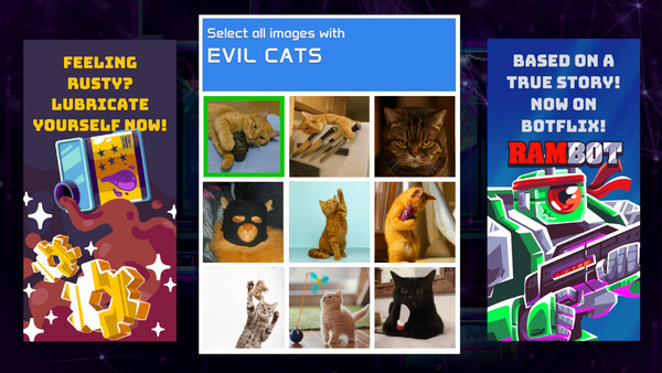 Uncover the secrets of a robot society where work shifts are endless and ads have no limits. Outsmart an absurdly strict CAPTCHA system and prove you’re smarter than AI. Fight to keep Earth from being overrun by all that spam!