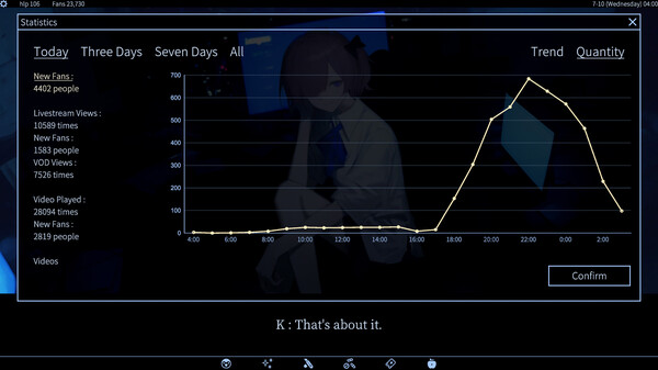 Love, Internet, and Murder Magic is a Roguelike game. You will role-play an agent of a streamer who died because of a murder. You are trying to "bring her back" through AI technology on the Internet, making her the unique creation of the Internet.