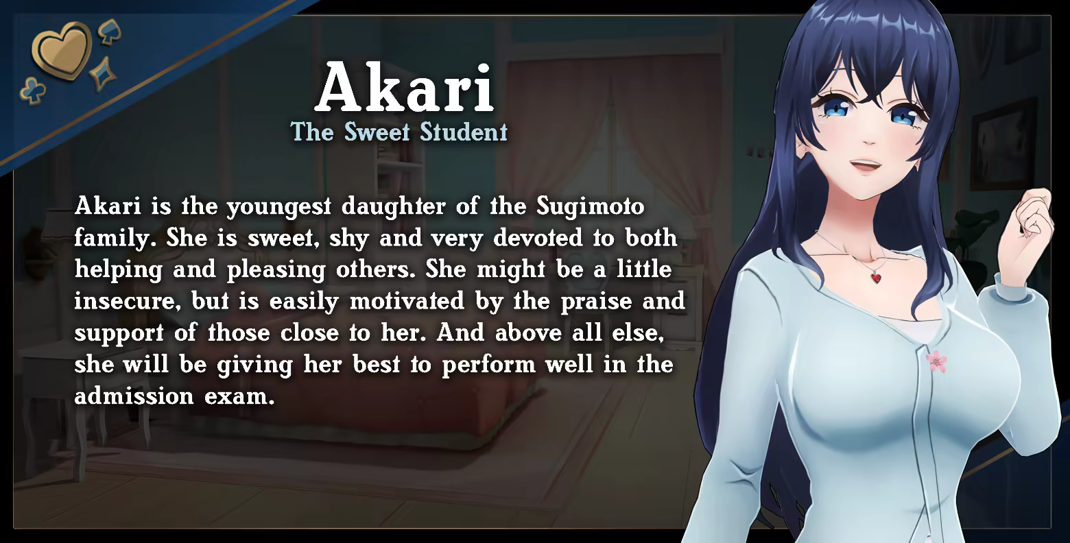 Akari's crucial exam is only 30 days away. The pressure is relentless and every moment counts. You’ll need to manage your time and energy carefully, as you unravel the secrets hidden within the lives of your new housemates...