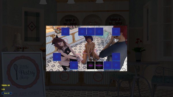 Train your brain with this memory game, revealing the naughty sexual adventures of 2 Neko girls and a guy in the pastry shop where they are working, in images hidden behind pairs of cards which you have to match.