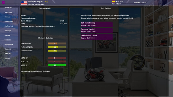 > Start your career with the entry level MGP3 machines or go full on with the MGP1 teams. There are hundreds of riders and staff to potentially sign to try to improve your teams performance.