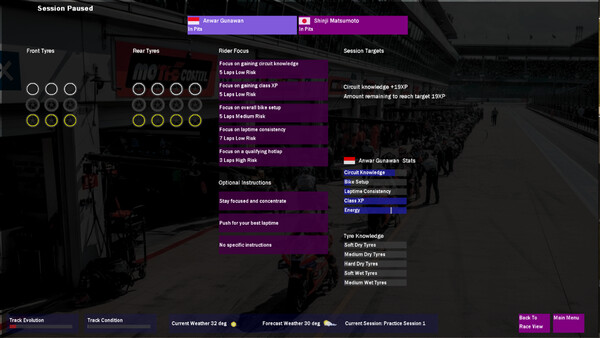 > Track Evolution - at the start of an event, the circuit will need time to 'rubber in' to allow riders to set their best times. Rain reduces circuit grip even after the track has dried so this needs to be monitored to ensure your riders are on track at the right time.