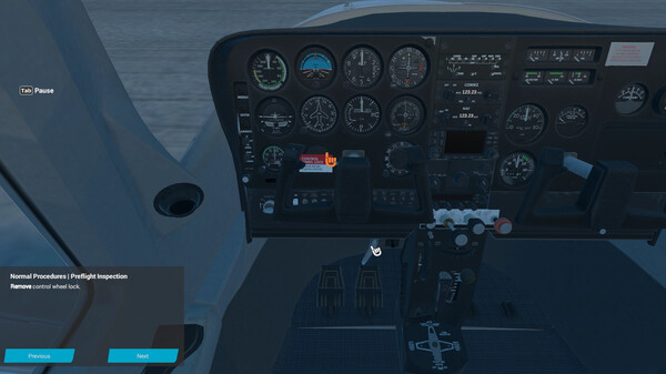 Preflight Inspection, beginning the normal procedures of a walk-a-round inspection in a first person perspective with guided visual highlights, instructional narration and text, and real time interactions of simple and visual selections.