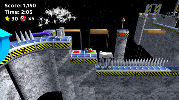 On A Roll 3D takes you beyond the stratosphere to a world of planets, moons, rockets and satellites. Take a shortcut via a UFO teleporter, or go on a "moonroll" in a low gravity chamber. You'll come across some old favourites in the shape of spinning spikes, flame throwers and circular saws, each with some extra lethal enhancements, and you'll have to contend with brand new exploding stars, timed switches and space rovers. Be careful not to fall off the edge of any platforms... it's a long way down.Level 8 - Boulder Passage