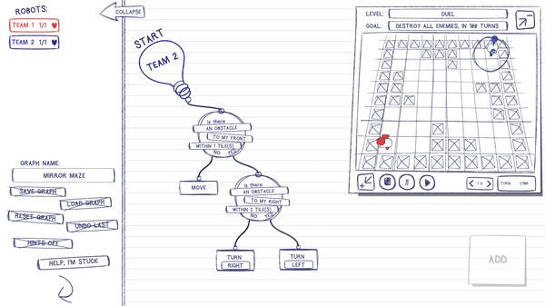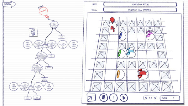 If you fail at first, there's a detailed overview of what decisions he's made and you can easily pinpoint where it all went wrong. After all, what is programming other than iterating through solutions, getting closer and closer with each step, until that wonderful moment at the end when you clench your fist with pride after a successful run and take your well earned walk around the room to show everyone just how clever you really are. This is how Sketchbots will help you feel with each completed level, all while enjoying its beautiful, school-notebook-inspired, art design.