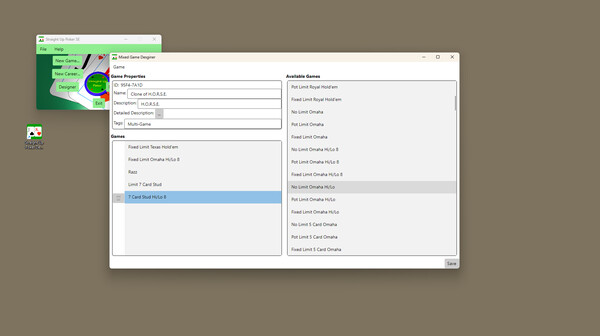 A highly customizable, offline, single player poker game, with over 130 different built in poker game types, and a rules editor to create your own poker types.
