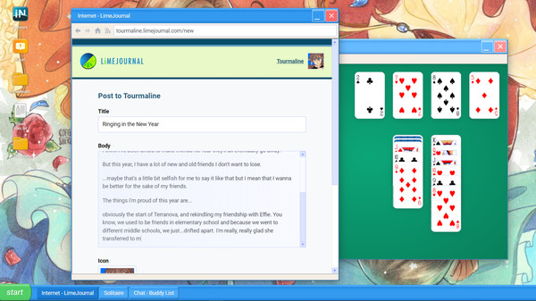 A nostalgic interactive fiction game set in the early 2000's. Chat with your friends, update your LimeJournal, and discover yourself through a rich world of storytelling, love and friendship.