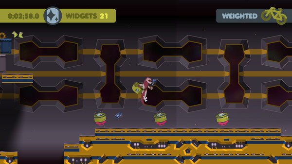 Widgets: you want them! But every widget you collect adds to the weight of your satchel, making it a little harder to reach the next platform or avoid the station’s maintenance bots. Levels can be relatively easy if you don't collect any Widgets, but they become a greater challenge as you fill Sprocket’s satchel.