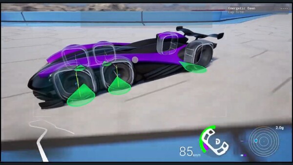 The game has a complex car physics including tire, wheel, suspension dynamics, aerodynamics: (front, rear wings and body contributions).